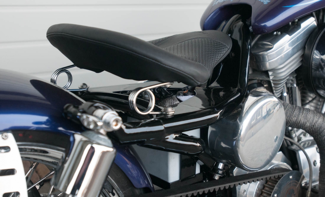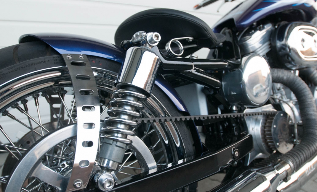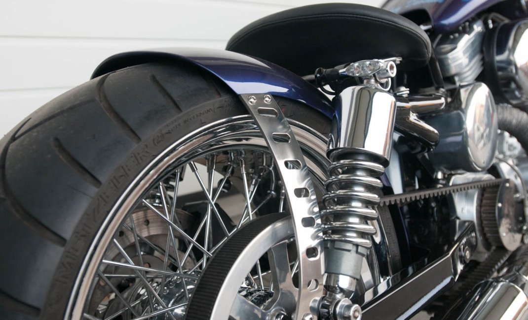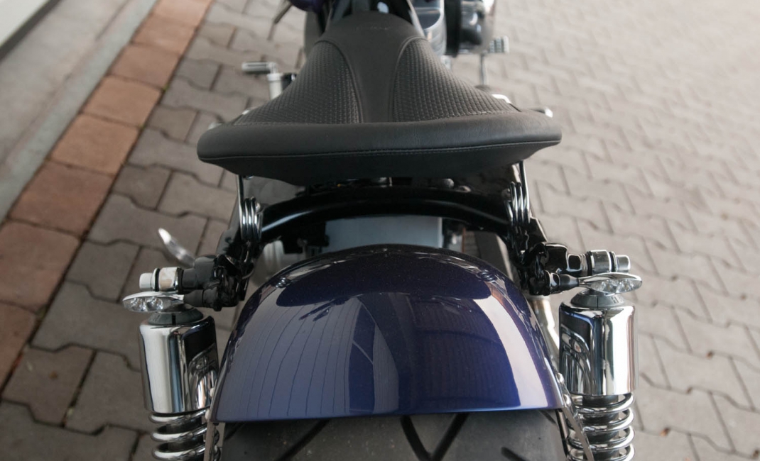 Das Rahmenheck wurde um 9cm abgesenkt und verbreitert so dass ohne Probleme ein 240er Breitreifen mittig montiert werden kann. Der mitschwingende Heckfenderfügt sich super in die Linie ein und unterstreicht den Custom Look.